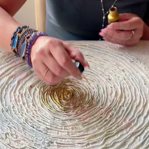 Branco e dourado se unem nesta obra para irradiar paz, conexão e espiritualidade